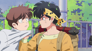 Ryoga Hibiki detiene al jabalí con su paraguas y pregunta dónde está la Escuela Furinkan con un mapa de Tokio, pero está en Shikoku. Ryoga está buscando a Ranma. La voz de Ryoga es de Kōichi Yamadera y estoy feliz de que siguiera con el personaje, no podría escuchar a otro como Ryoga.