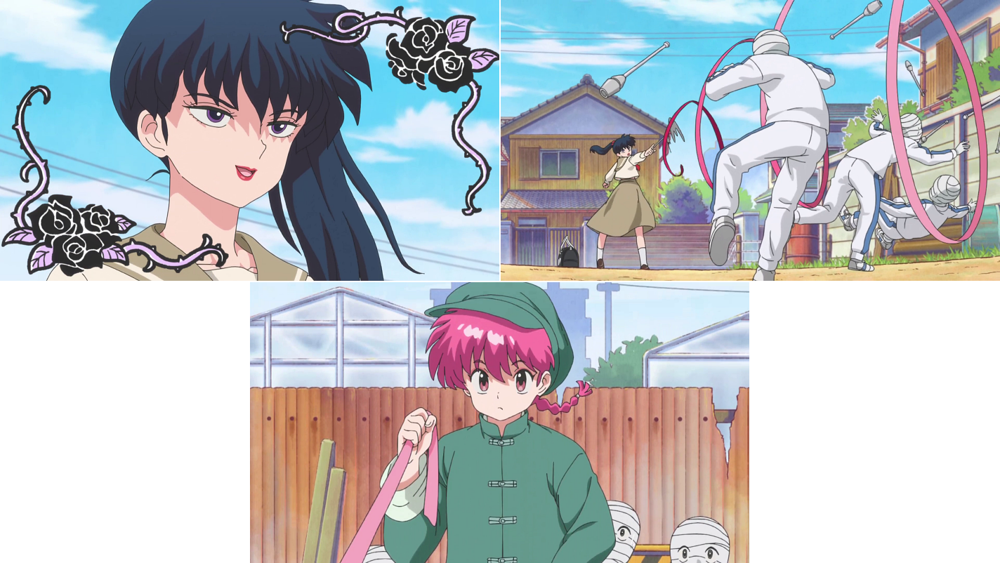 Ranma, al que le dieron nikuman gratis por su cara bonita, ve como una chica le da una paliza a unas que están todas vendadas. Ranma se interpone y la chica lo ataca a él. Al ver que Ranma es bueno, ella desiste y se presenta como Kodachi, la rosa negra. La antigua voz de Kodachi no regresa, esta vez la hace Ayane Sakura. A ella la he escuchado en Spy x Family como Fiona Frost / Nightfall y cuando me enteré de que ella sería la que la interpretaría, estaba segura de que le saldría perfecto, porque cuando se vuelve loca por Loid es muy Kodachi 😂.