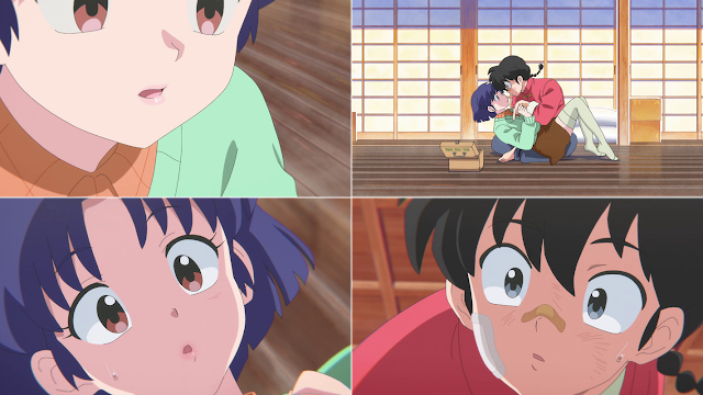 Ranma está en el dojo, molesto porque todos se burlaron de él y a nadie le importa lo que siente. Y Akane llega con el botiquín, porque a ella sí le importa (me gustó mucho ese efecto de como gira la cámara cuando Akane le da un golpe a Ranma). Akane lo regaña por bajar la guardia y haberse dejado besar y le dice que a ella no le habría pasado. Con un rápido movimiento, Ranma la pone en su regazo y se quedan ahí mirándose. ¡Ay, son tan bonitos! Me encantó el énfasis que hicieron en los labios de Akane, que muestran como Ranma tiene la atención en ellos.